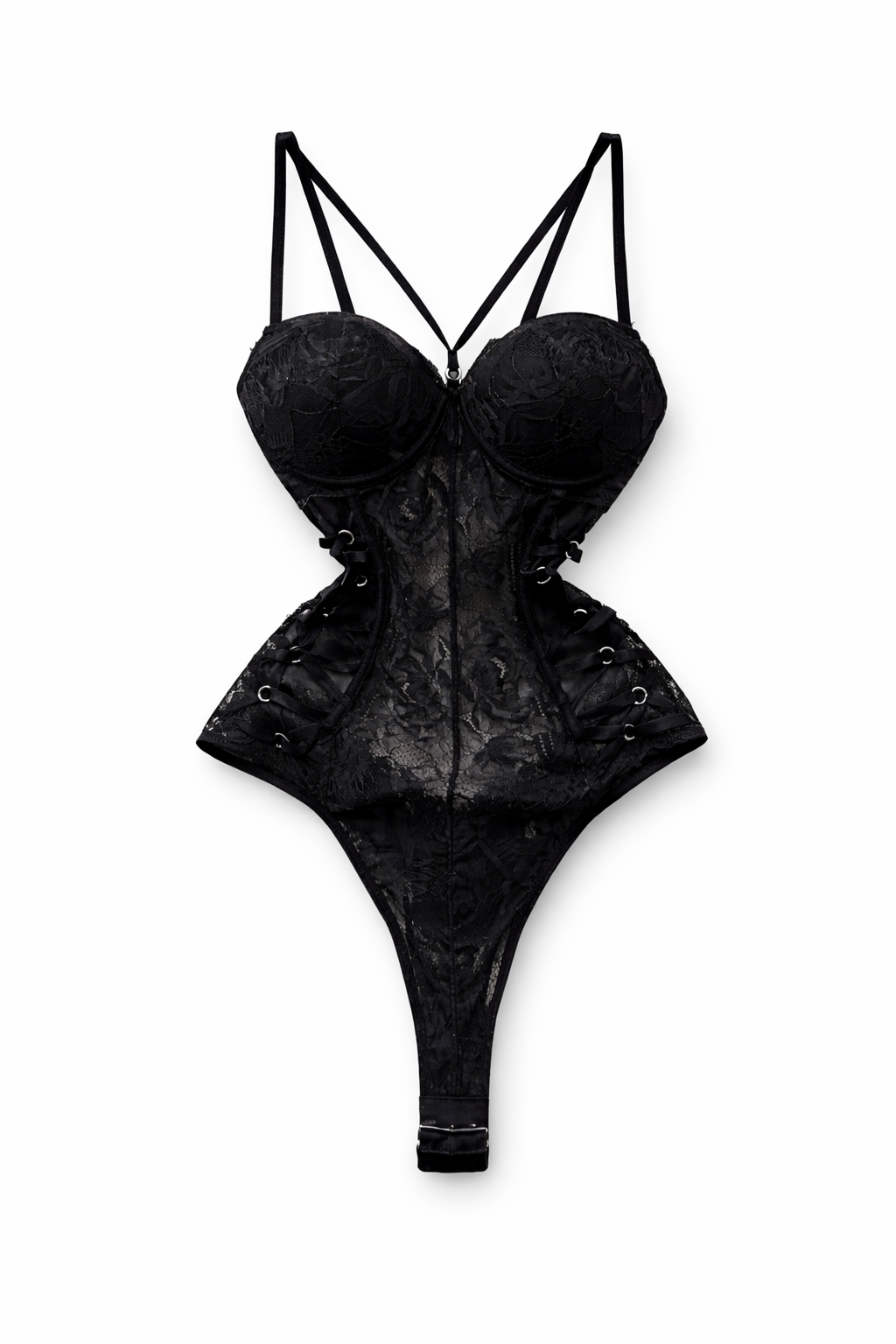 Son bustier à coques structurées met la poitrine en valeur tout en assurant un excellent maintien. La dentelle florale semi-transparente apporte une touche de délicatesse et de mystère, tandis que les découpes latérales lacées soulignent la taille et créent un effet corset très flatteur.