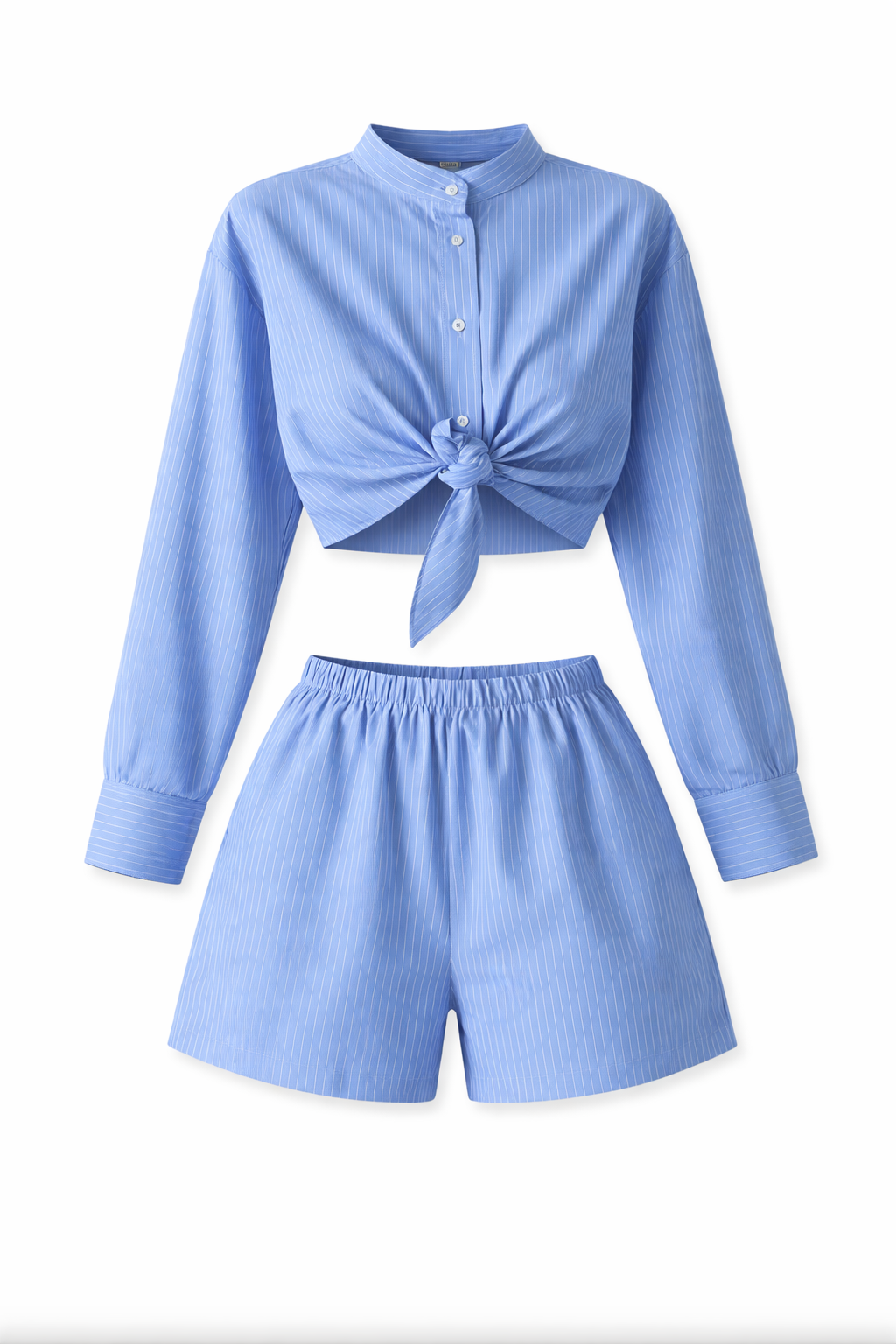 Ensemble deux pièces bleu à fines rayures, composé d’une chemise nouée à la taille pour une touche moderne et décontractée, et d’un short taille haute à coupe fluide. Les manches longues et le col structuré apportent de l’élégance, tandis que la silhouette reste légère et estivale. Un look chic et effortless.
